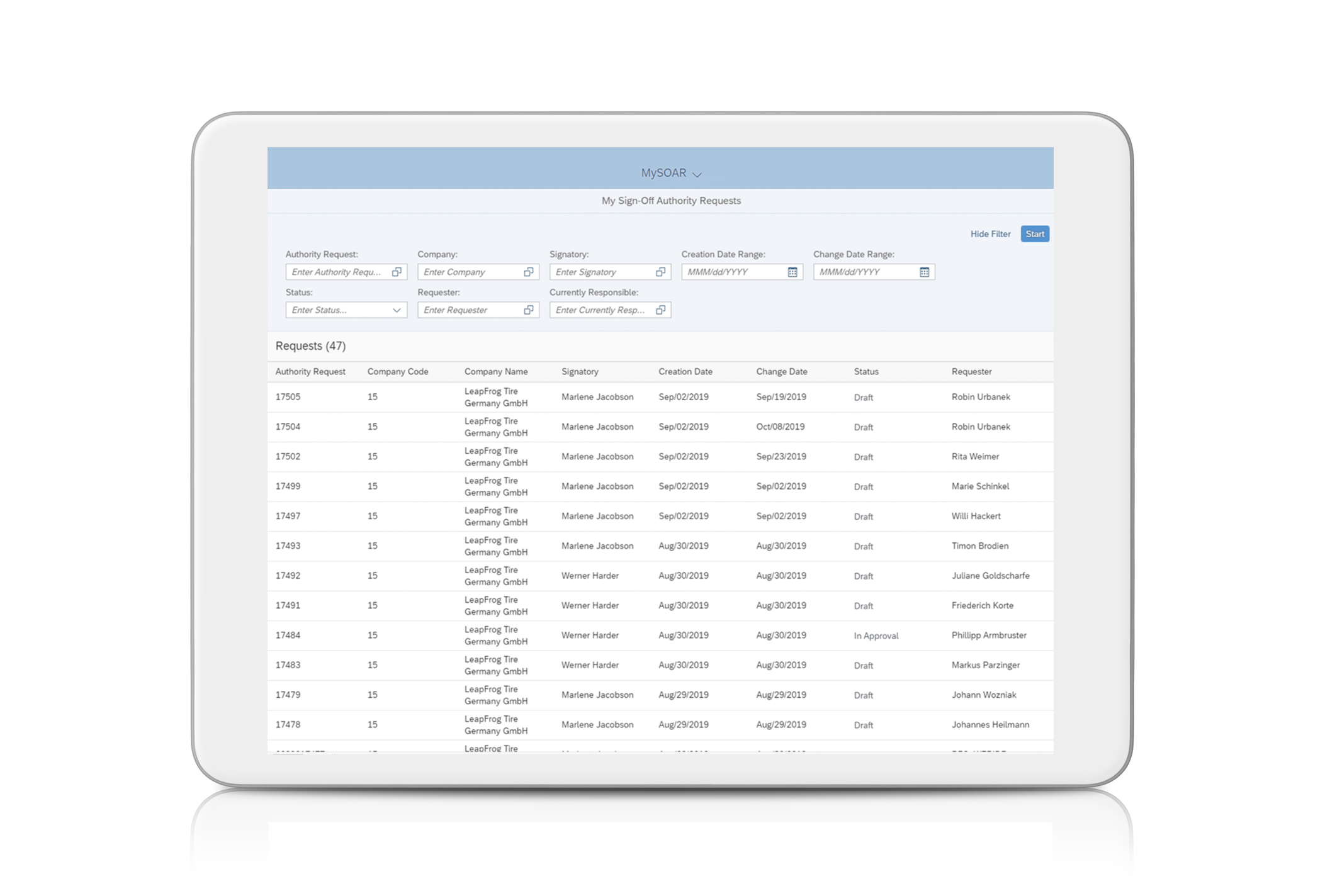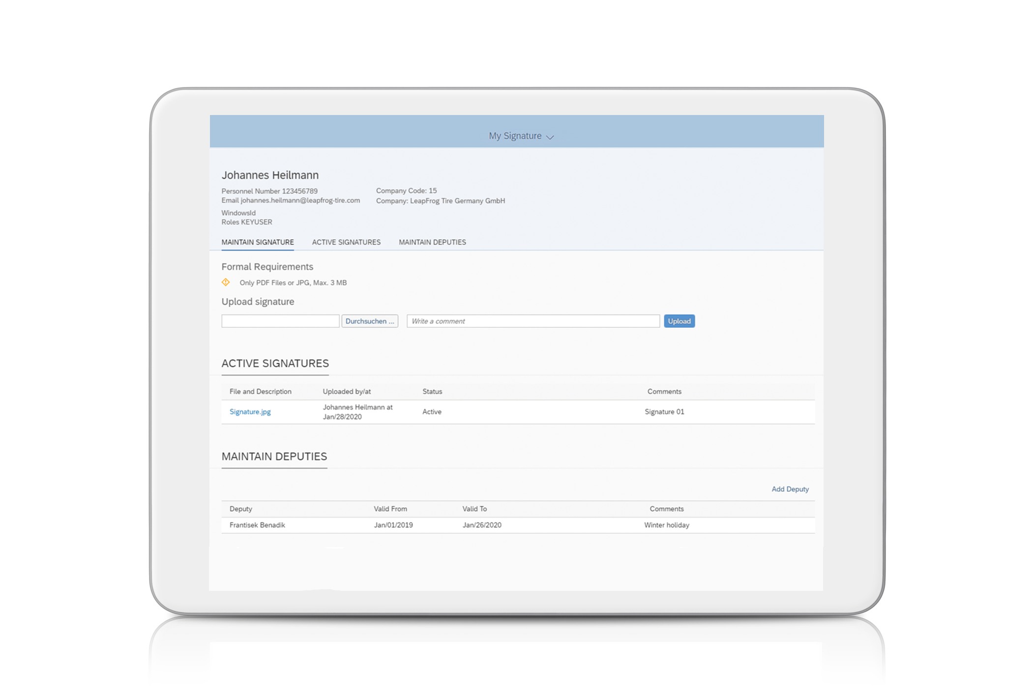 Signatory powers empower employees to conclude transactions. They often have a limited life span and are usually restricted to projects, areas of responsibility or budgets due to their high security relevance. Requests for new signatory authorizations can only be confirmed by a legally valid signature of authorized users. For these cases, we have developed a solution that includes the following features:
